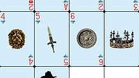 I made some cards to go along with the game. These replace the playing cards. The Spades and the Clubs suits are both represented by Skulls to simplify things a bit. The two crowns are the Joker cards...